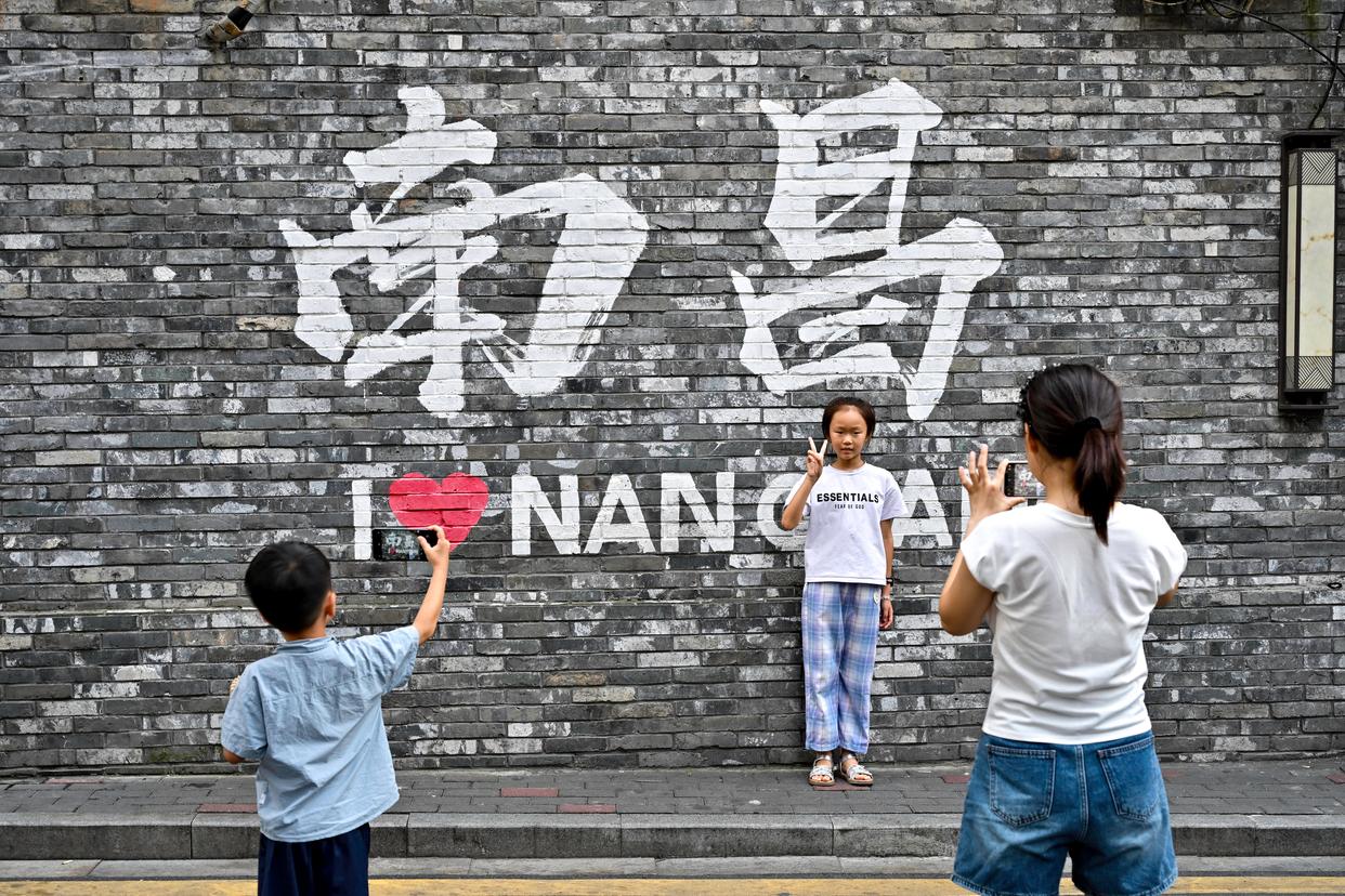 7月7日,游客在江西南昌滕王阁景区附近的半步街打卡留影。新华社记者 刘金海 摄