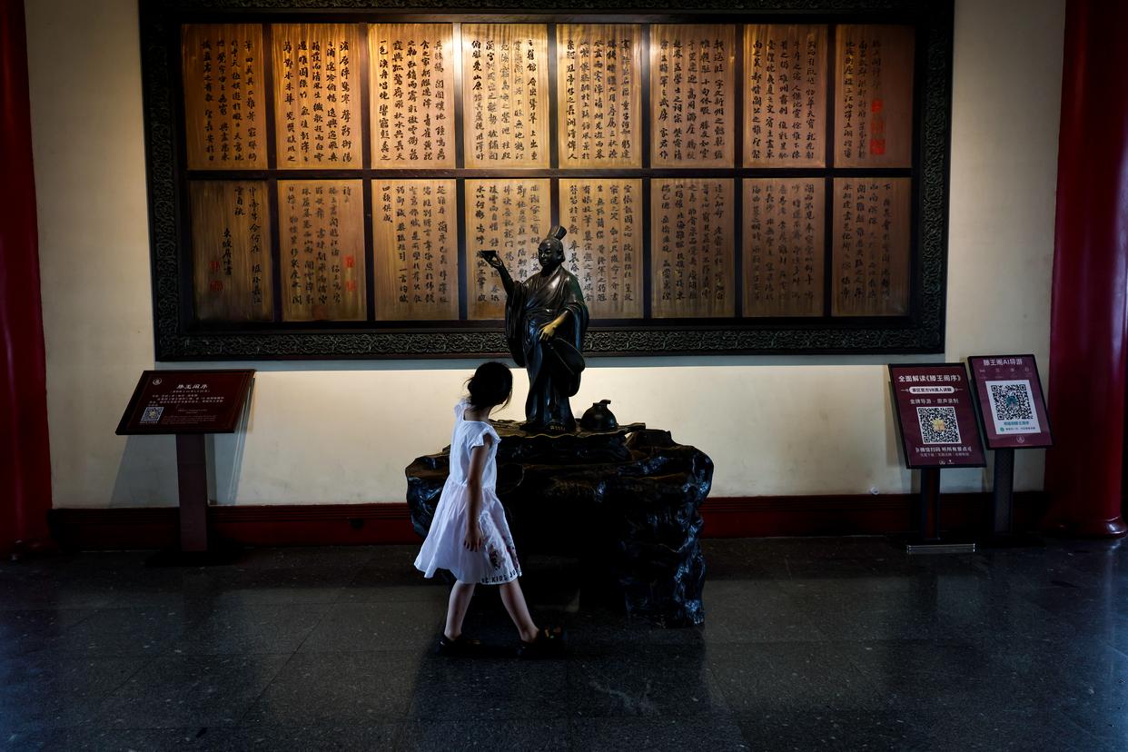 7月7日,一名小朋友在江西南昌滕王阁内的《滕王阁序》铜碑前驻足。新华社记者 刘金海 摄