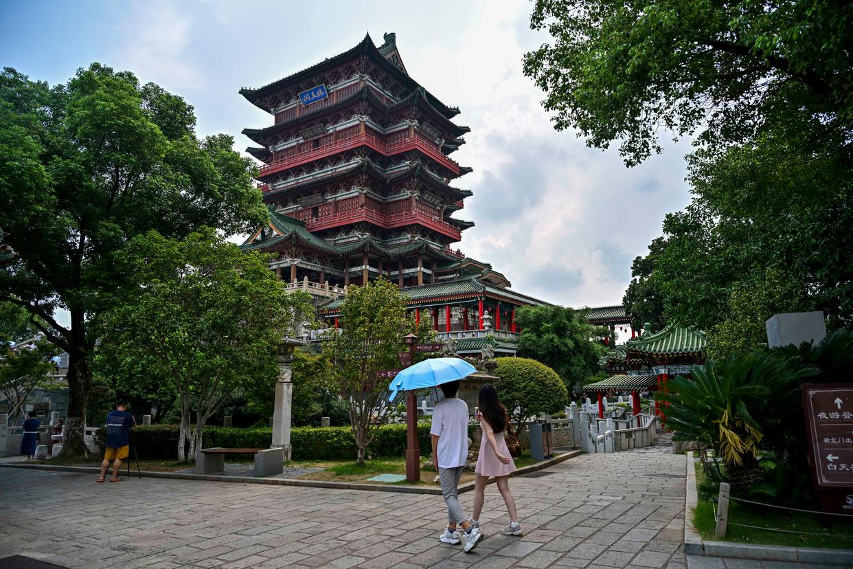 7月7日,游客在江西南昌滕王阁景区内休憩。新华社记者 刘金海 摄