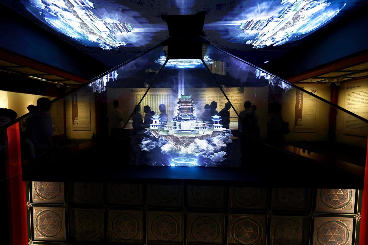 7月7日,游客参观江西南昌滕王阁内的历代滕王阁建筑景观全息数字复原展示。新华社记者 刘金海 摄