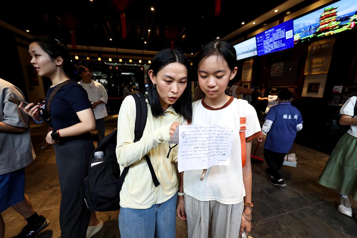 7月7日,一位来自广东东莞的母亲拿出打印好的《滕王阁序》,帮助女儿温习巩固,期待背诵通关。近年来,滕王阁景区推出背诵《滕王阁序》全文免门票活动,吸引了各地游客前来挑战。新华社记者 刘金海 摄