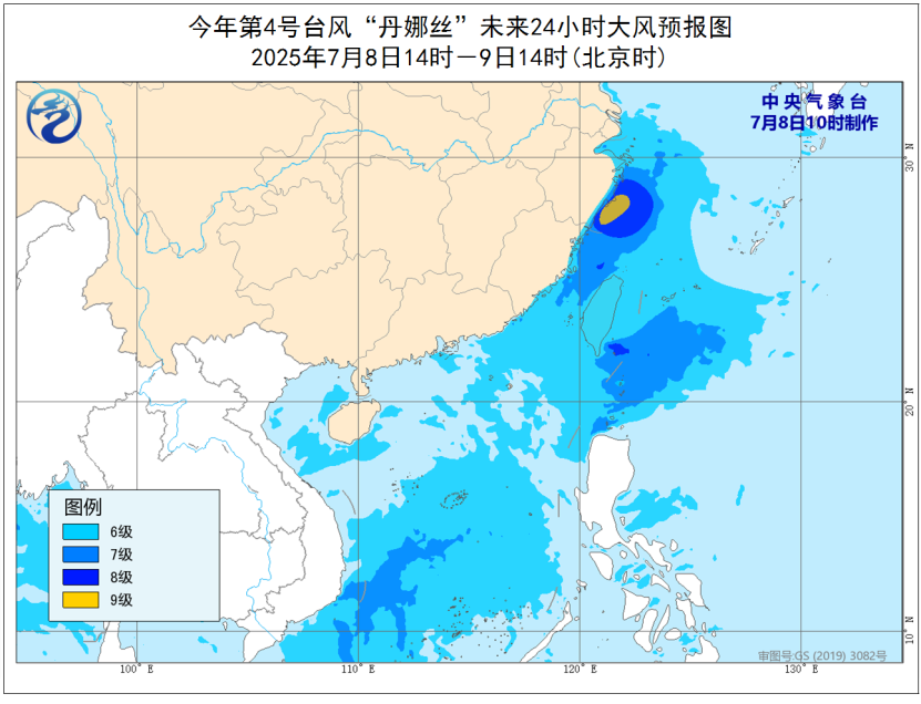 大风预报:7月8日14时至9日14时,东海及钓鱼岛附近海域、台湾以东洋面、浙江沿海、福建沿海、上海沿海、江苏东南部沿海、长江口区、台湾岛沿海、广东东部沿海、台湾海峡、巴士海峡、南海东北部和西南部将有6~7级大风,其中“丹娜丝”中心经过的附近海域和地区风力可达8~9级、阵风10~11级。