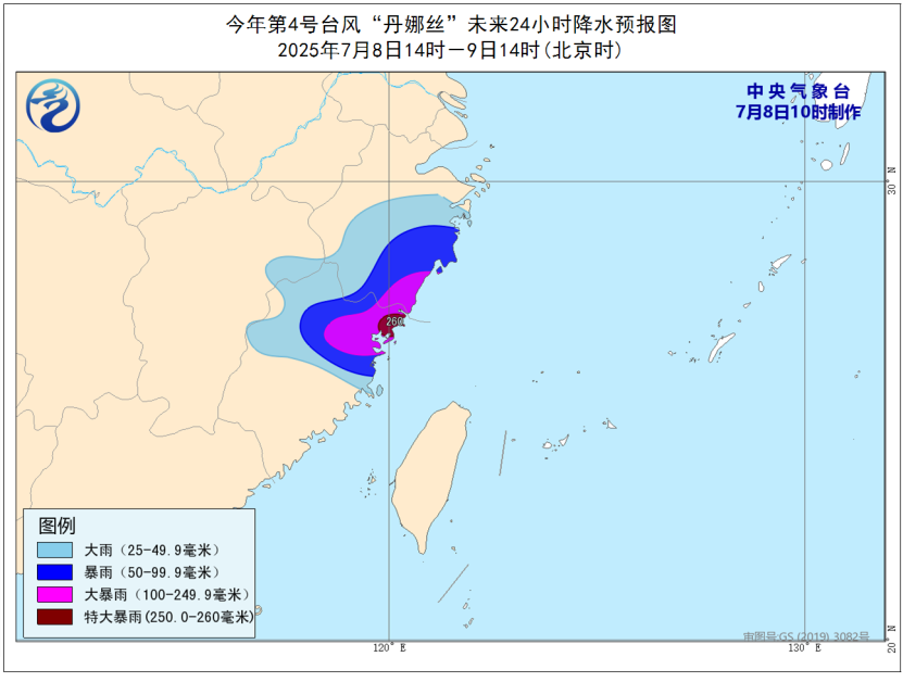降水预报:7月8日14时至9日14时,浙江中南部和东部、福建北部等地有大到暴雨,其中,浙江东南部、福建东北部等地的部分地区有大暴雨,局地特大暴雨(250~260毫米)。