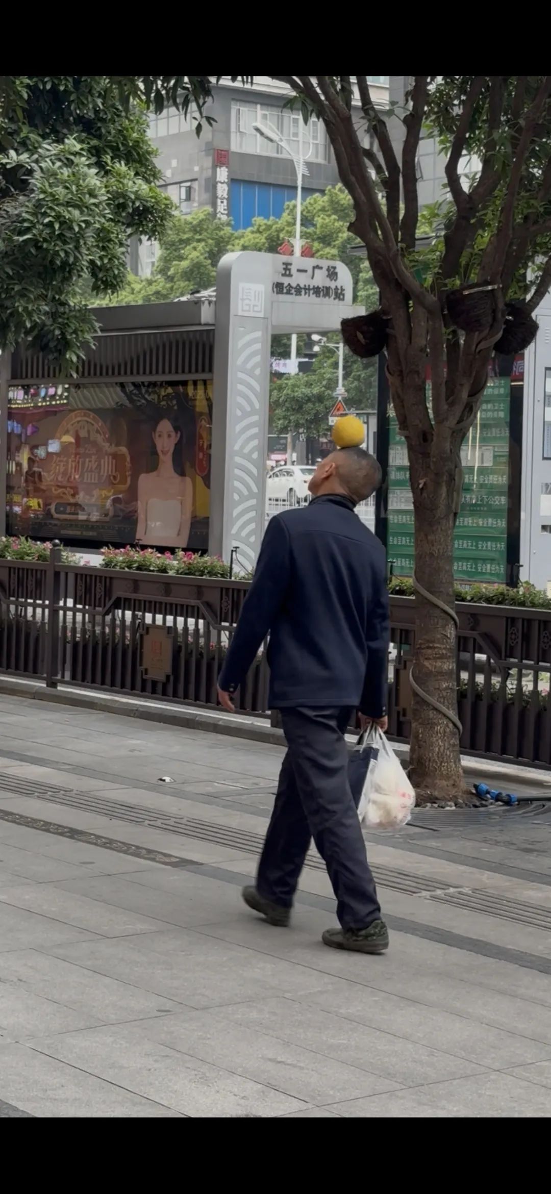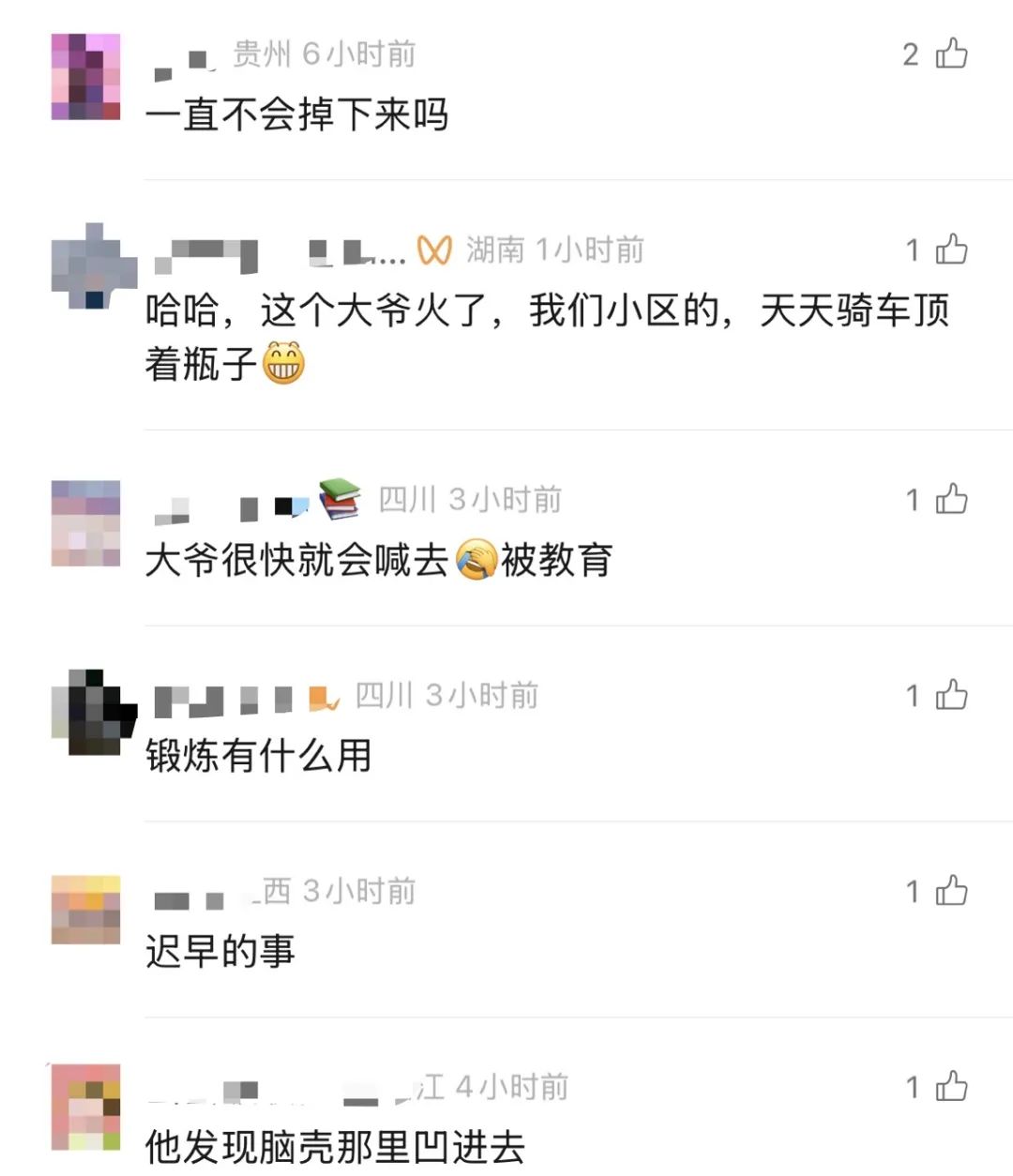 有网友打趣,大爷是不是绑定了“必须顶一个物品的系统”。还有网友疑惑,这样不会脖子疼吗?你怎么看?欢迎留言说说。
