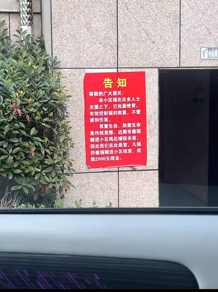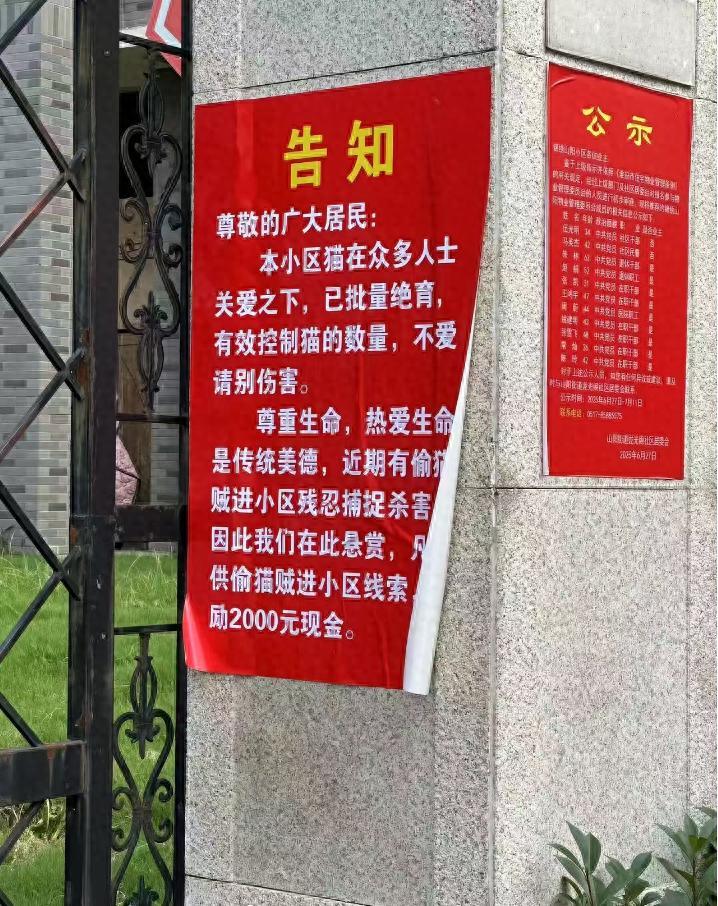 记者看到,这则致广大居民的告示称,本小区猫在众多人士关爱之下,已批量绝育,有效控制猫的数量,不爱请别伤害。近期有偷猫贼进小区残忍捕捉杀害,因此我们在此悬赏,凡提供偷猫贼进小区线索,奖励2000元现金。