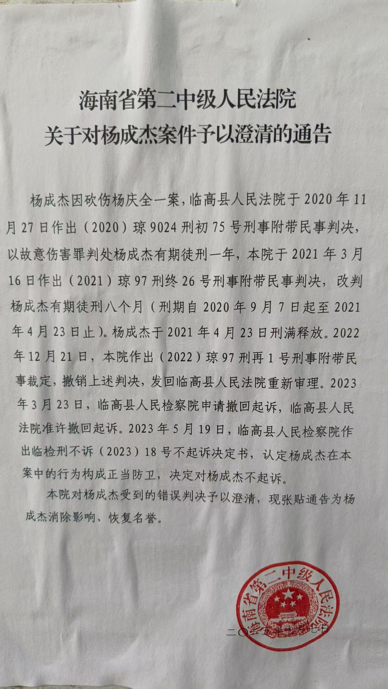 《澄清通告》显示,临高县人民检察院 认定杨成杰在本案中的行为构成正当防卫,决定对杨成杰不起诉。本院对杨成杰受到的错误判决予以澄清,现张贴通告为杨成杰消除影响、恢复名誉。杨成杰的儿子告诉华商报大风新闻记者,这份《澄清通告》张贴的时间为7月7日中午,“当天,法院方面有来进一步沟通国家赔偿事宜。”“国家赔偿决定还未出具,法院起初称可以给100%的精神抚慰金(家属申请约11万元),不赔礼道歉。7月7日,法院工作人员说,可以给50%,然后贴出了这份《澄清通告》。”杨成杰的儿子表示:“这份公告张贴在我们村村委会的村务公开栏,我们希望消除影响、恢复名誉的方式是公开登报道歉。”杨成杰的代理律师王艳涛说,杨成杰及其家属的诉求,是由法院院长通过公开登报的方式,在海南省有影响范围内致歉,为杨成杰的错误判决消除影响、恢复名誉,赔礼道歉,“我们认为法院的方式范围都不对。法院没有公开登报致歉,仅将通告贴在村委会公开栏。其张贴的文书也并非致歉声明,而是澄清通告。”