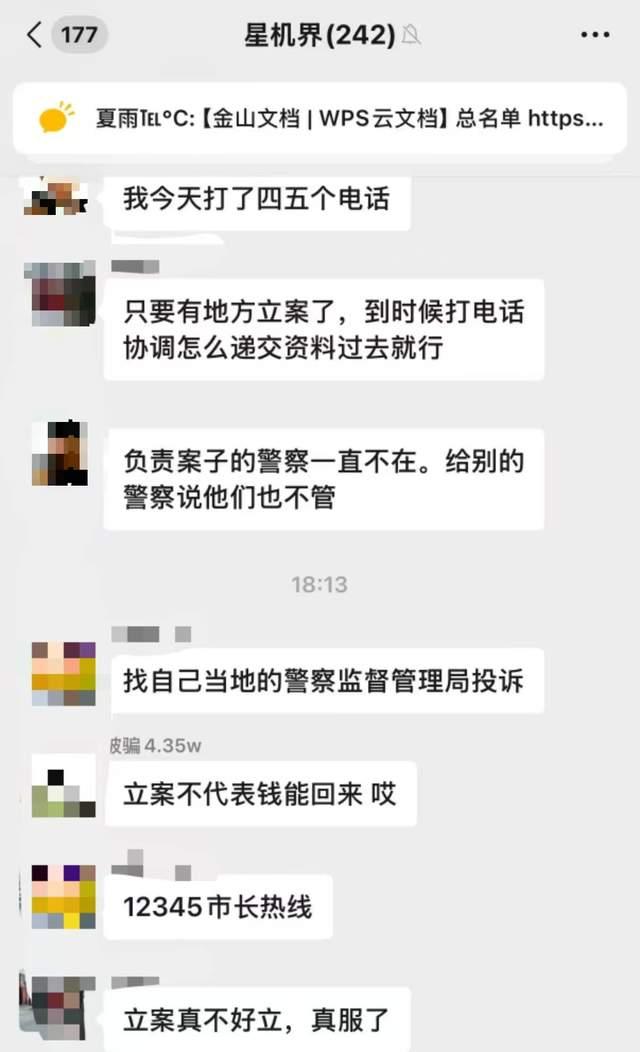 7月8日,记者在张伊的邀请下进入了该“维权群”,发现群内的人数已达242人。群内来自河北的李女士告诉记者,她已于7月5日向当地警方报案。另有受害者表示,他们已着手准备材料,深圳公安福田分局华强北派出所已立案,7月5日,派出所曾回复受害人称,“目前案件正在侦办中,因为案件涉及全国各地,建议受害人可先在当地报案,后续各地警方会协同调查。”