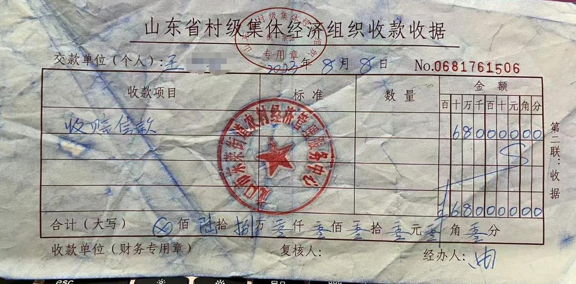 2023年8月8日,王女士的丈夫老王向龙口市东莱街道农村经济管理服务中心缴纳了68万元的“赔偿款”。