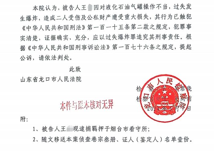 龙口市人民检察院认为,王女士因对液化石油气罐操作不当,过失发生爆炸,造成二人受伤及公私财产遭受重大损失,其行为已触犯《中华人民共和国刑法》相关规定,犯罪事实清楚,证据确实、充分,应以过失爆炸罪追究其刑事责任并就此提起公诉。