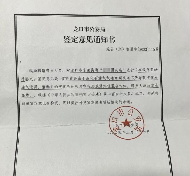 爆炸发生后不久,2023年3月27日,龙口市公安局出具《鉴定意见通知书》,显示该事故是由于液化石油气气罐角阀关闭不严导致液化石油气泄漏,泄漏后的液化石油气与空气形成爆炸性混合气体,遇点火源后发生爆炸。