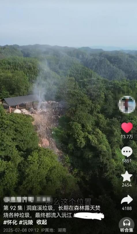 2025年7月8日上午,一名叫“渔猎齐哥”的抖音博主发布了沅陵县七甲坪镇一处森林露天焚烧垃圾的视频。经核实,为沅陵县七甲坪镇桃坪村一处临时生活垃圾焚烧点。