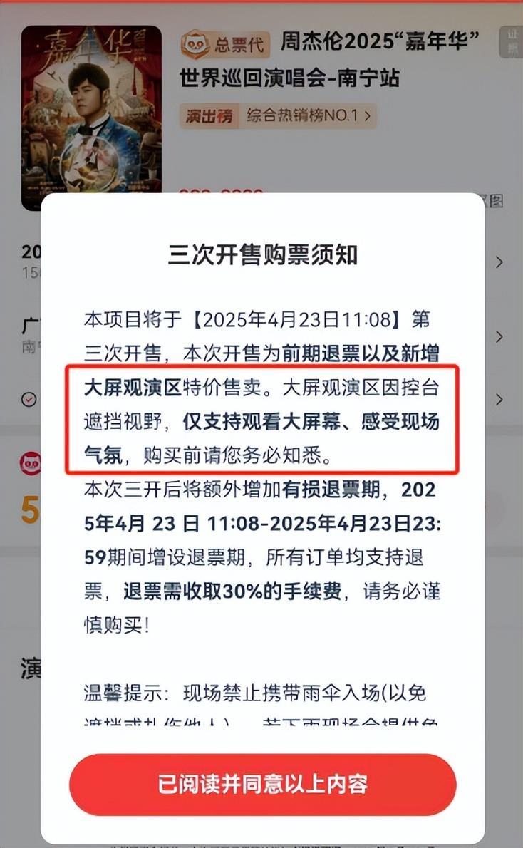 4月下旬,周杰伦2025“嘉年华”世界巡回演唱会南宁站第三次开售时,新增了特价大屏观演区,售价480元。该区域因视线被遮挡且售价较高,引发了不小的争议。