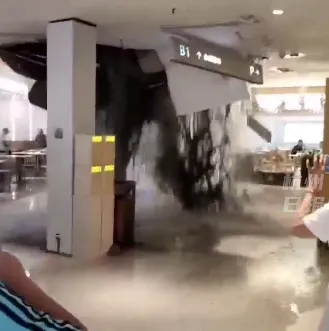商场工作人员回应称事发现场位于附一楼B一层,系暴雨引起公共管道破损所致,事发后经紧急抢修已恢复原样,商场营业没有受到太大影响,此事也无人员受伤。