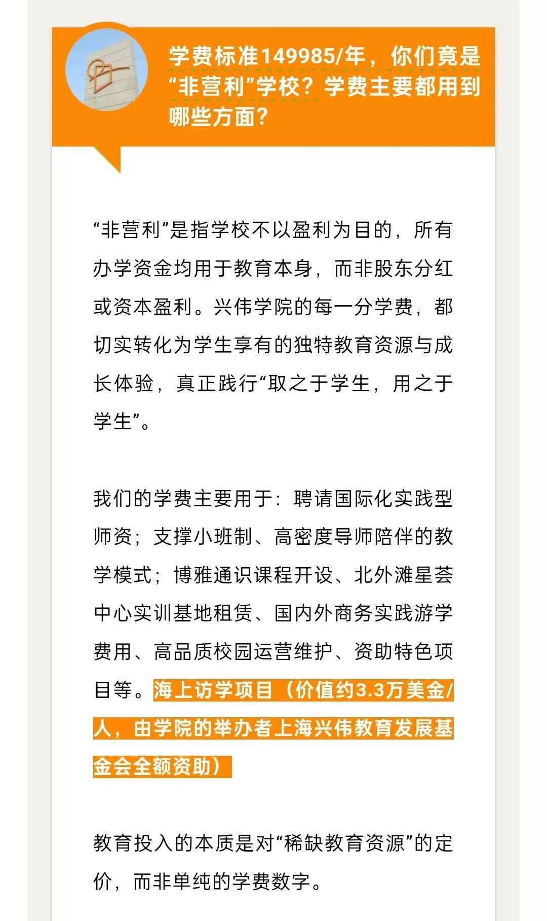 近日,正值高考结束后择校期,有用户发视频称,他注意到一所名为上海兴伟学院的高校,学费为149985/年,他发文表示对该校的收费较为好奇。