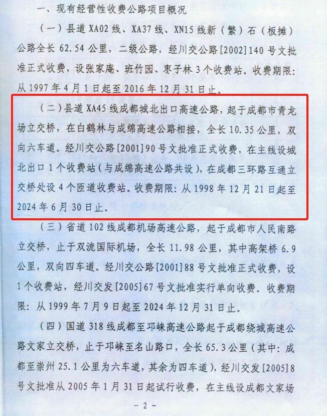 2024年11月29日,四川省交通厅向胡磊出具《政府信息公开答复书》的同时,附带了《关于成都市经营性公路项目车辆通行费车型分类标准调整的批复》【川交发[2005]136号】显示,县道XA45线成都城北出口高速公路,收费期限为“1998年12月21日起至2024年6月30日止。”