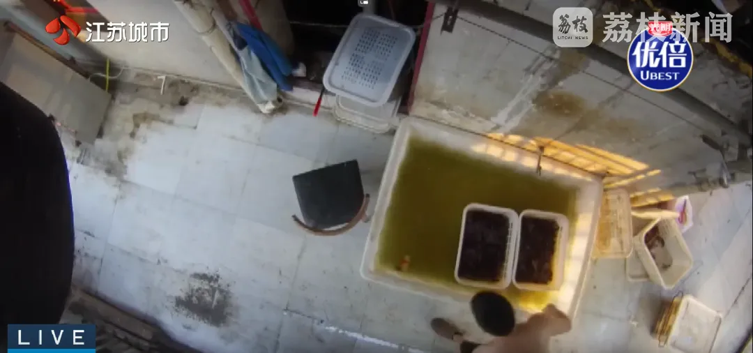记者前往调查时,发现加工好的熟龙虾就摆放在走廊的通道里,走廊的另一侧,有人正在用方形容器清洗龙虾,清洗龙虾的水已经严重变色,并且发出难闻的酸臭味。