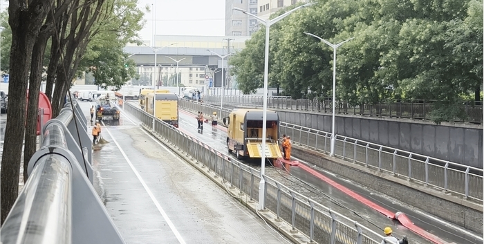 9日下午,新黄河记者走访了石家庄积水严重的地区,看到积水已排空,交通已恢复。在石家庄桥西区裕华路与中华大街立交桥下,不少拖车正在运走被积水淹没的车辆,部分车主正在清理车辆。从现场车辆上的痕迹可以看到,积水已淹至车窗,不少车辆被浸泡过后仍在向外滴水。此外,裕华路站前街以西道路两侧,不少停放的车辆受积水影响漂上了人行道。在石家庄新华区友谊大街北段地道桥下,桥下积水已被排涝车排空,环卫工人正在清洗道路上的沉积物。