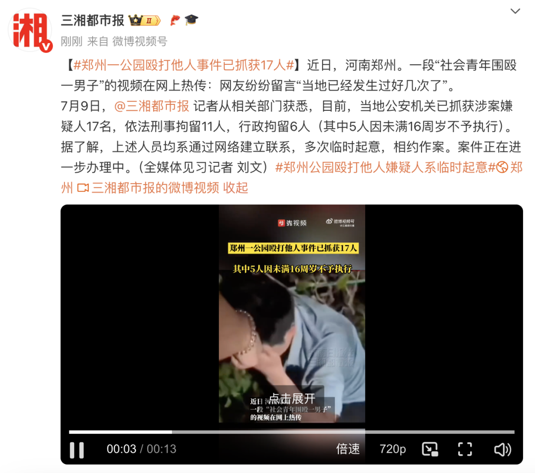 警方回应“郑州人民公园打人事件”:刑事拘留11人,行政拘留6人(其中5人因未满16周岁不予执行),多次临时起意、相约作案