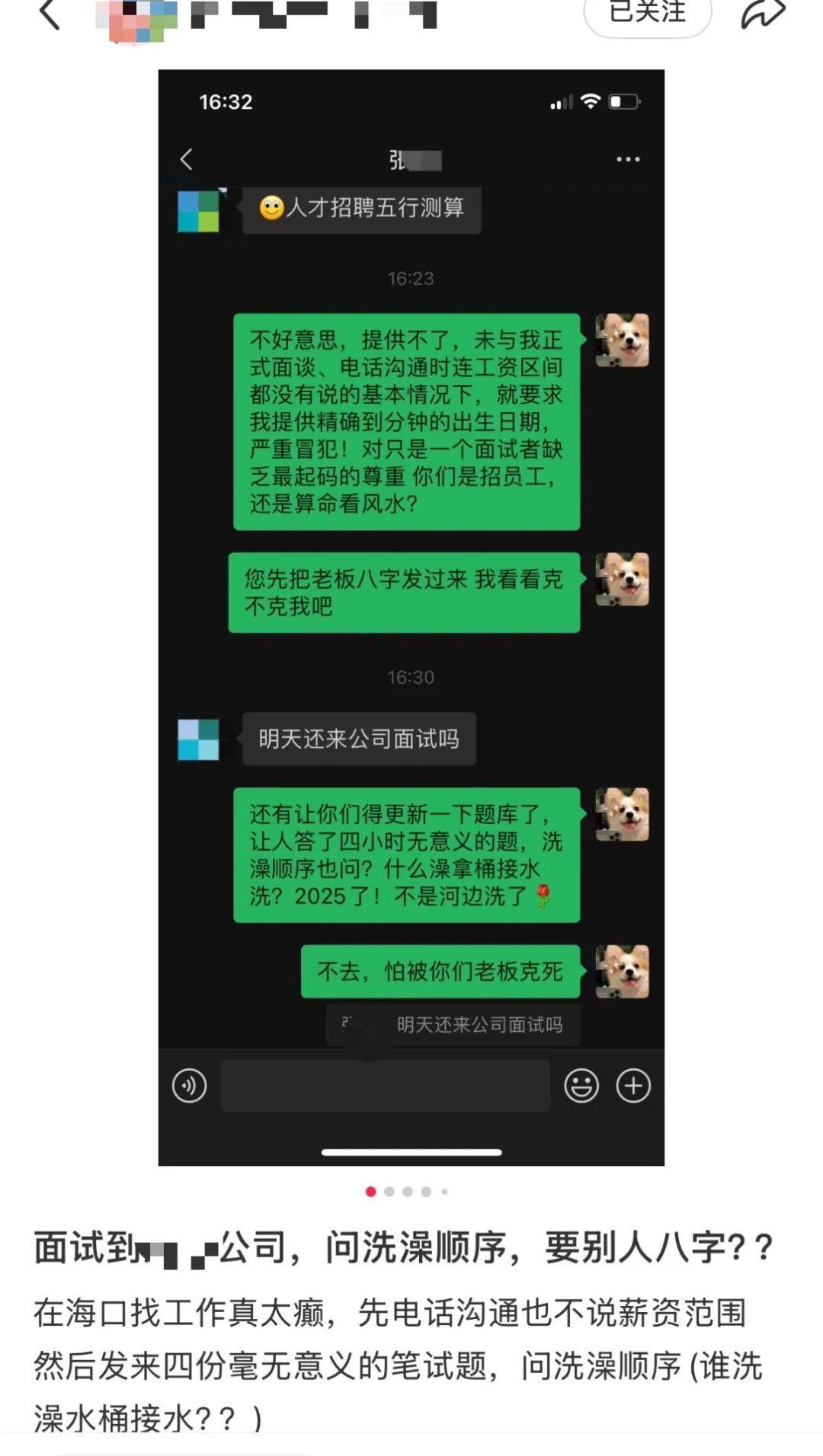 近日,海南一网友发文称“求职面试被HR索要生辰八字”引发网友关注。7月9日,大河报《看见》记者以应聘者身份向涉事公司咨询岗位招聘要求,该公司HR同样表示“初审需要提交五行测算”。