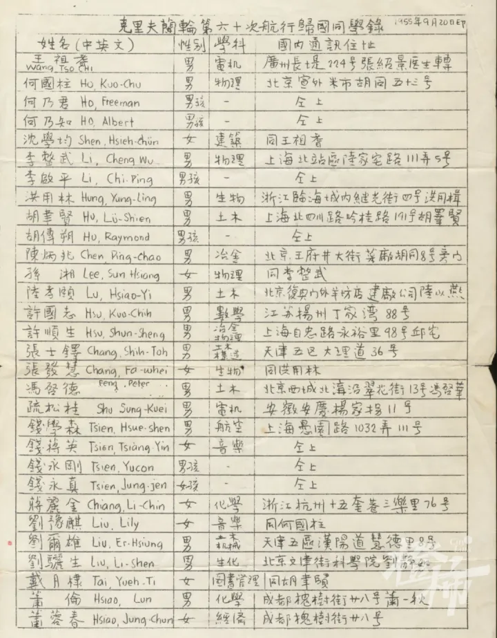 在洛杉矶起锚后,为了便于联系,王祖耆编辑了一张30人的“克利夫兰轮第六十次航行归国同学录”名单,并动手刻板和油印了几十份,分发给大家。