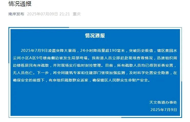 2025年7月9日凌晨突降大暴雨,24小时降雨量超190毫米,突破历史极值,辖区奥园水云间小区A区9号楼南侧边坡发生局部垮塌。我街道人员立即赶赴现场查看情况,迅速组织周边楼栋居民有序疏散,并对现场实行临时封控管理。目前,所有疏散人员均已得到妥善安置,无人员伤亡。下一步,将会同建筑专家和住建部门继续加强监测,及时科学处置安全隐患,在确保安全的前提下,有序组织疏散群众返家,确保辖区人民群众生命财产安全。