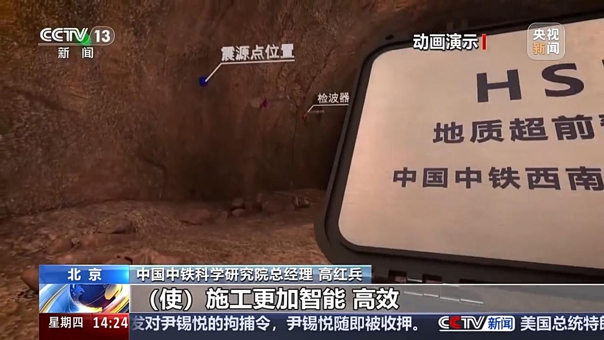 中国中铁科学研究院总经理 高红兵:它利用刀盘与岩石的摩擦,产生震动信号,实时采集隧道前方100米不良地质信息,包括断层、涌水,及时纠正各项参数,使施工更加智能高效。