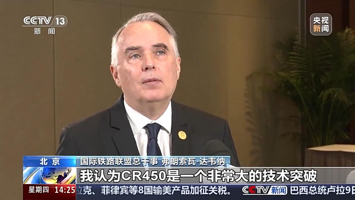 国际铁路联盟总干事 弗朗索瓦·达韦纳:我认为CR450是一个非常大的技术突破,比起日本等国现有的技术,它实现了更高的速度提升,使世界高铁运营速度向前迈出了新的一大步。