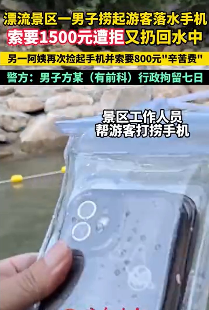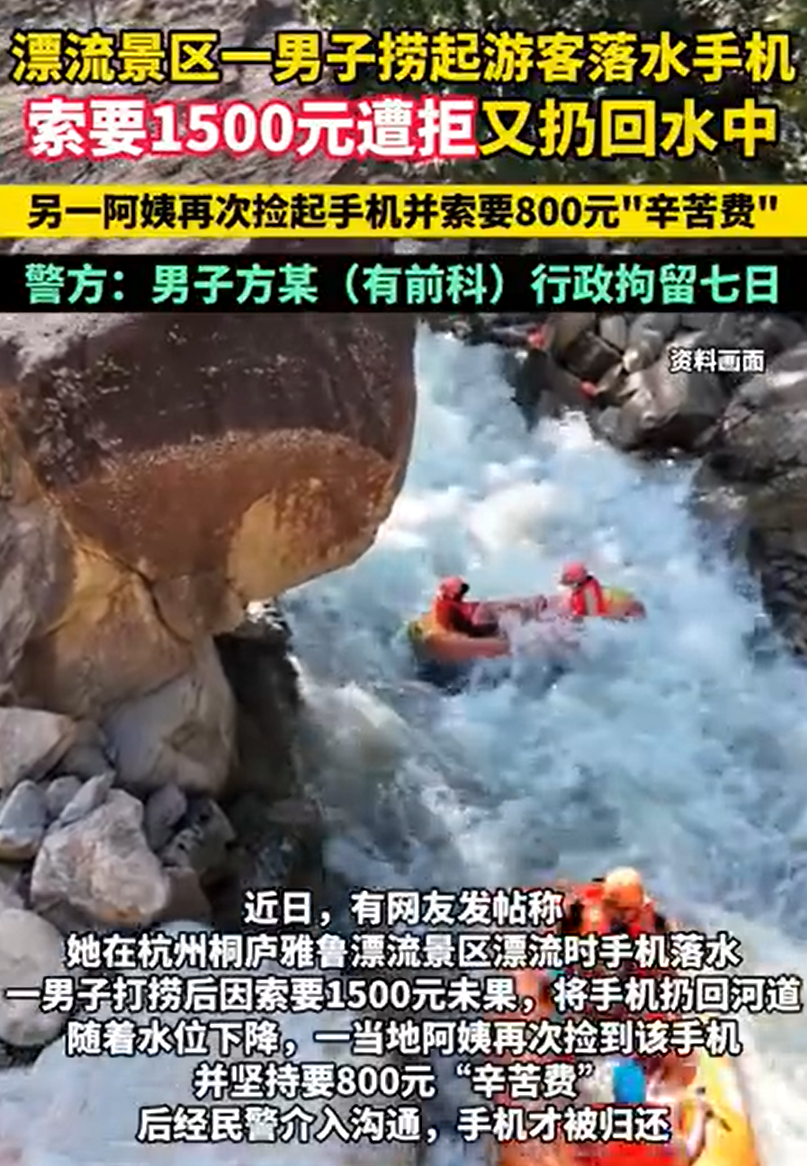 近日,有网友发帖称,她在杭州桐庐雅鲁漂流景区漂流时手机落水,一男子打捞后因索要1500元未果,将手机扔回河道,无奈之下该网友选择报警,最终在警方协助下取回手机,并且警方对涉事男子进行了行政拘留7日处罚。