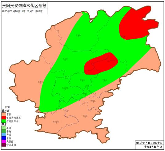 据最新气象资讯,贵阳市气象台7月10日15时30分别发布强对流黄色预警(Ⅲ级)以及暴雨蓝色预警(IV级):预计7月10日15时至11日08时,贵阳贵安将出现较大范围的雷雨天气,云岩区、南明区、观山湖区、乌当区、白云区、清镇市、开阳县、息烽县、修文县、花溪区、贵安新区局地将出现短时强降水、冰雹、8级以上雷雨大风其中息烽县、修文县、开阳县、白云区、观山湖区、清镇市等区(市、县)部分乡镇将出现暴雨(50-99.9毫米)