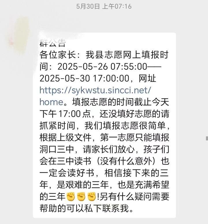 聊天记录截图显示,5月30日,洞口三中“创新班”的一位老师在家长群里发消息称,“根据上级文件,第一志愿只能填报洞口三中。请家长们放心,孩子们会在三中读书(没有什么意外),也一定会读好书。”