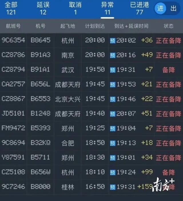 “飞常准”显示,当晚多趟航班均显示“备降”。