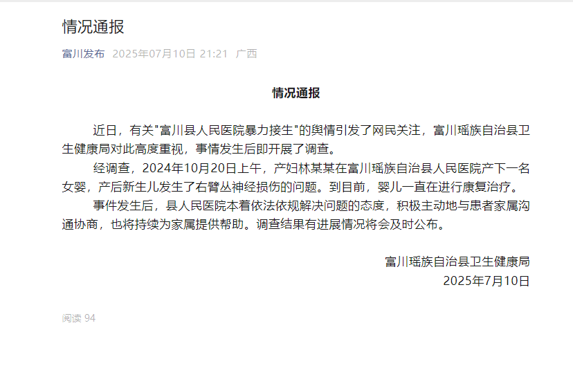 经调查,2024年10月20日上午,产妇林某某在富川瑶族自治县人民医院产下一名女婴,产后新生儿发生了右臂丛神经损伤的问题。到目前,婴儿一直在进行康复治疗。事件发生后,县人民医院本着依法依规解决问题的态度,积极主动地与患者家属沟通协商,也将持续为家属提供帮助。调查结果有进展情况将会及时公布。