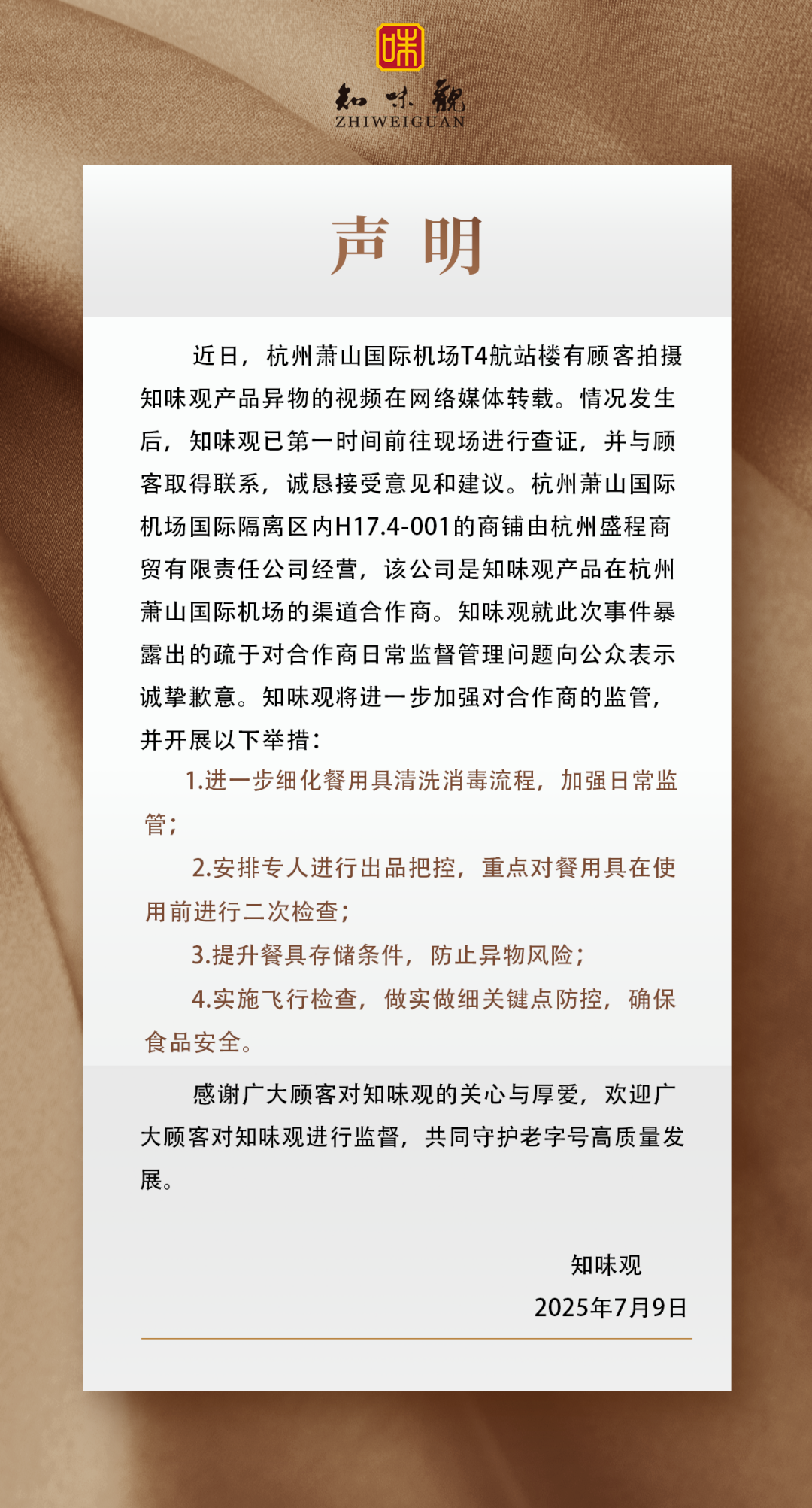 近日,杭州萧山国际机场T4航站楼有顾客拍摄知味观产品异物的视频在网络媒体转载。情况发生后,知味观已第一时间前往现场进行查证,并与顾客取得联系,诚恳接受意见和建议。杭州萧山国际机场国际隔离区内H17.4-001的商铺由杭州盛程商贸有限责任公司经营,该公司是知味观产品在杭州萧山国际机场的渠道合作商。知味观就此次事件暴露出的疏于对合作商日常监督管理问题向公众表示诚挚歉意。知味观将进一步加强对合作商的监管,并开展以下举措: