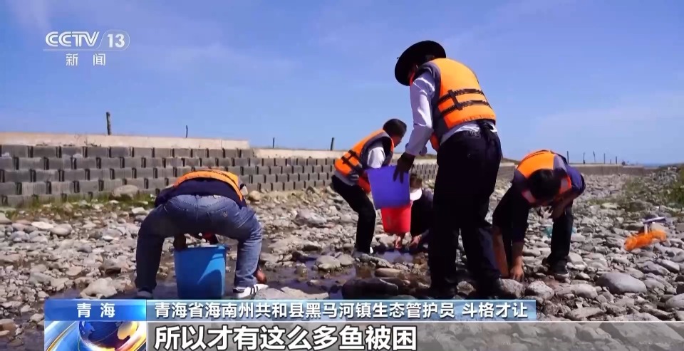 青海省海南州共和县黑马河镇生态管护员 斗格才让:最近天气越来越热了,导致青海湖周边降水越来越少了,入湖河流的水位下降。现在正是青海湖湟鱼溯河洄游产卵的旺季,鱼多加上水浅,所以才有这么多鱼被困。