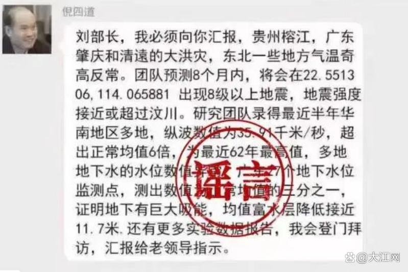 据公安部网安局7月11日消息,经查,罗某良(男,32岁)于6月30日在互联网平台发布了所谓的“倪四道”院士的聊天截图,内容涉及预测广东将发生8级以上大地震,造成该谣言信息传播扩散,造成当地居民恐慌,扰乱公共秩序。目前,属地公安机关已对罗某良作出行政处罚。