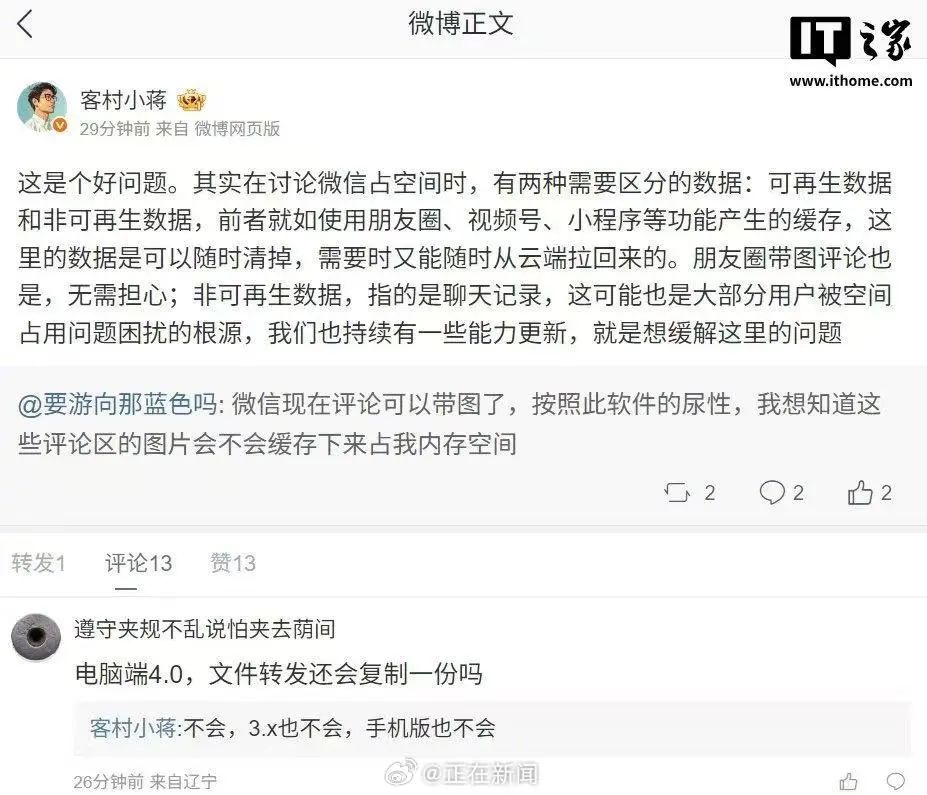 对此,微信员工 @客村小蒋 回应称:“这是个好问题。其实在讨论微信占空间时,有两种需要区分的数据:可再生数据和非可再生数据,前者就如使用朋友圈、视频号、小程序等功能产生的缓存,这里的数据是可以随时清掉,需要时又能随时从云端拉回来的。”