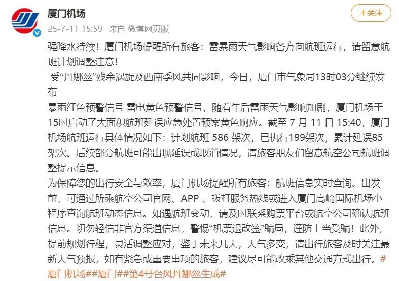 截至7月11日15:40,厦门机场航班运行具体情况如下:计划航班586架次,已执行199架次,累计延误85架次。后续部分航班可能出现延误或取消情况,请旅客朋友们留意航空公司航班调整提示信息。