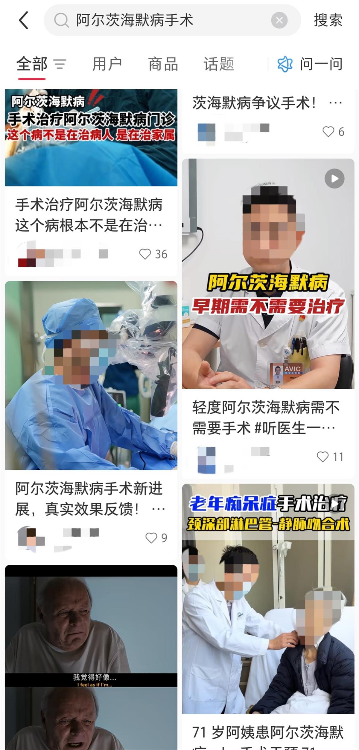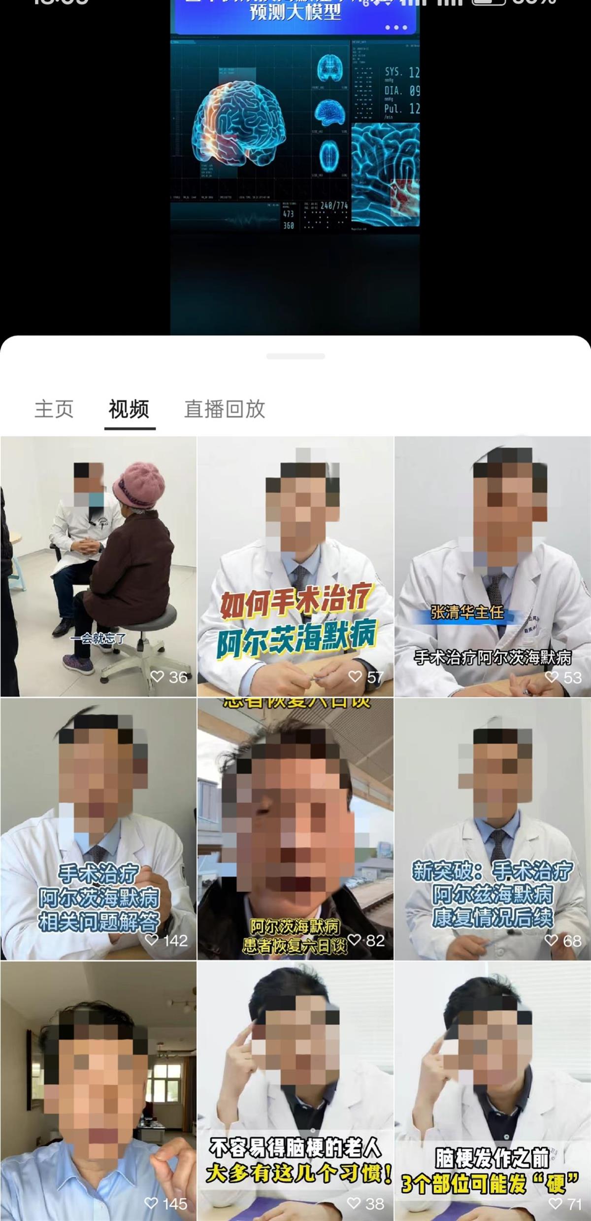 多名医生发布的阿尔茨海默病手术宣传视频未删除
