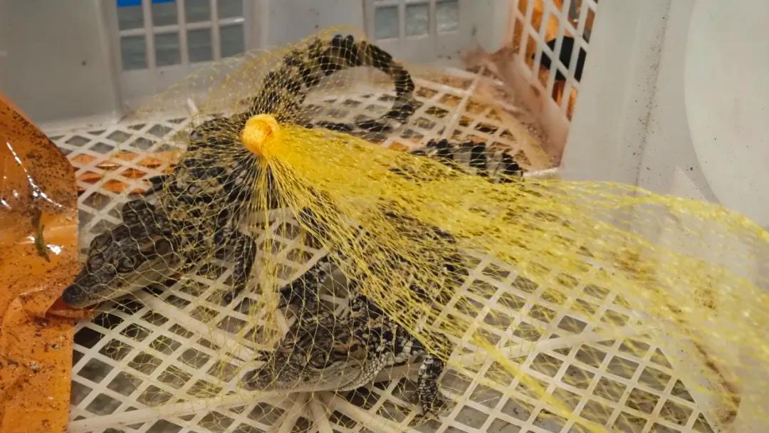 经进一步查验,海关关员在该旅客的行李中查获用网兜和塑料盒装裹的活体乌龟和鳄鱼。其中,活体乌龟共计34只,大小不一,大的约有成人手掌般大小;活体鳄鱼共2只,尚属幼体。