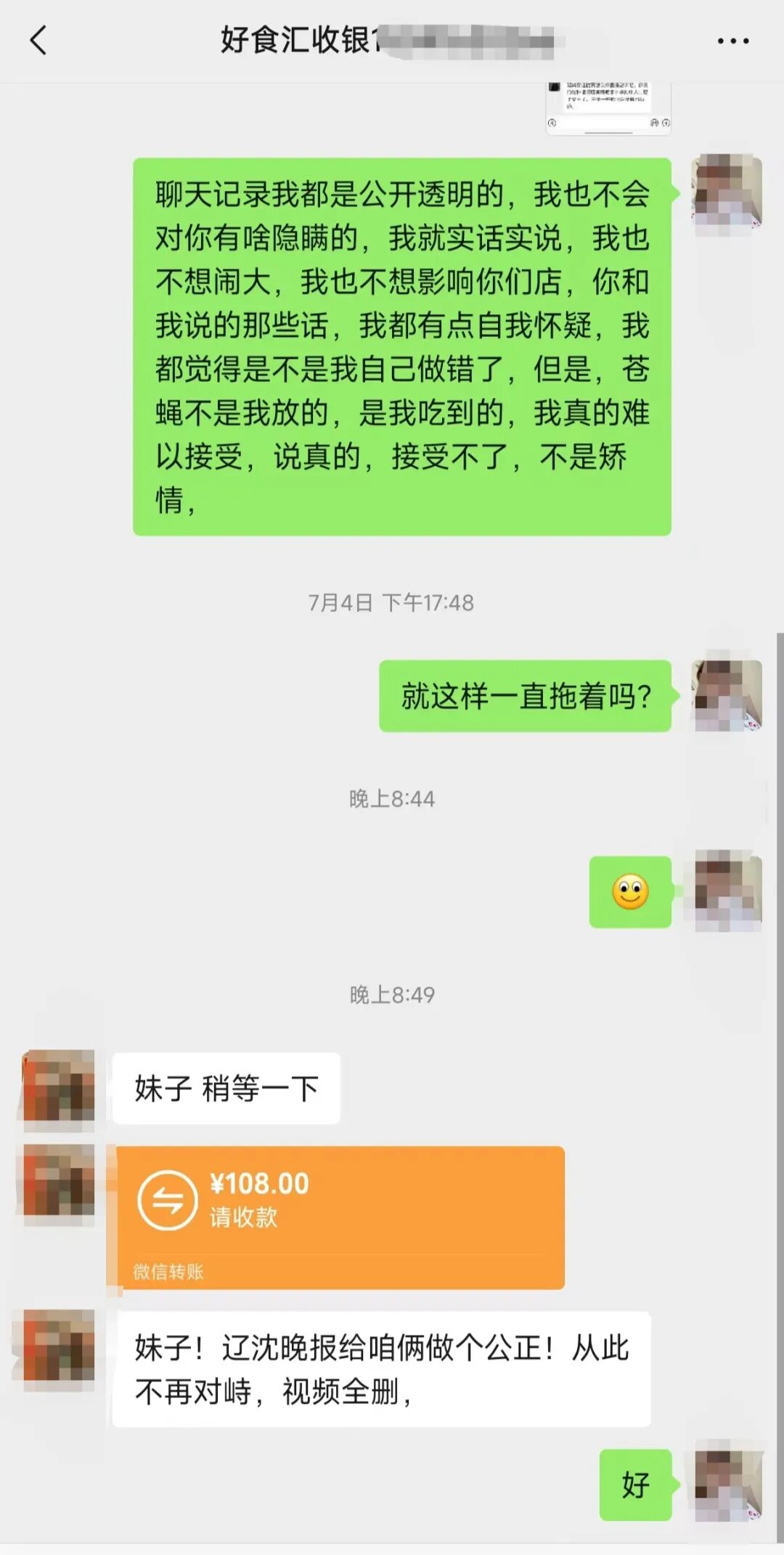 11日晚,“好实汇”店主在电话中告诉辽沈晚报记者,网络上恶意索赔的例子太多了,“对吃到苍蝇的真实性表示怀疑的同时,担心赔偿后会有更多要求,才拒绝和解”。