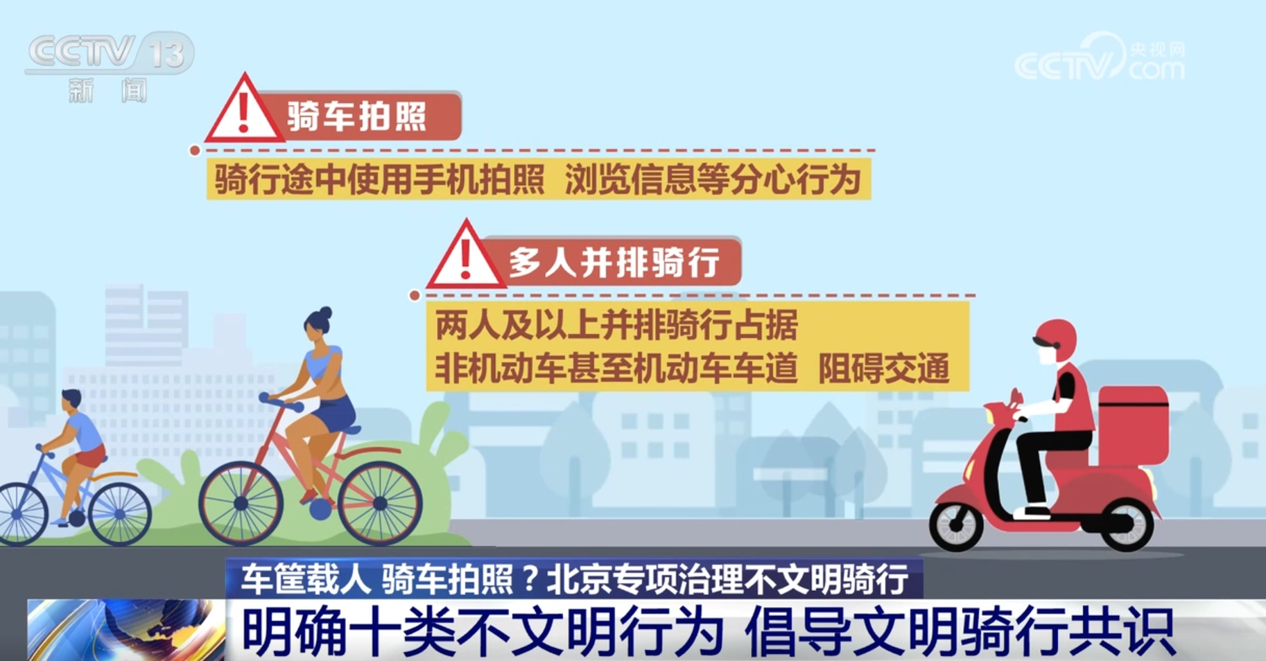 央视网消息:为进一步规范非机动车通行秩序,提升城市文明交通水平,近日,北京市公安交管部门会同市文明办等部门在全市范围内开展非机动车不文明行为专项治理行动。
