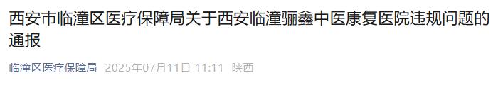 2024年7月31日至8月1日,国家医疗保障局对西安临潼骊鑫中医康复医院进行了飞行检查,临潼区医疗保障局根据国家局反馈的问题进行现场核查,发现该院存在一系列违法违规行为。近期,临潼区医疗保障局对该院开展了“回头看”专项检查,发现该院存在未按规定保存治疗记录问题,2024年国家飞检发现的违规问题基本整改到位。现将有关问题通报如下: