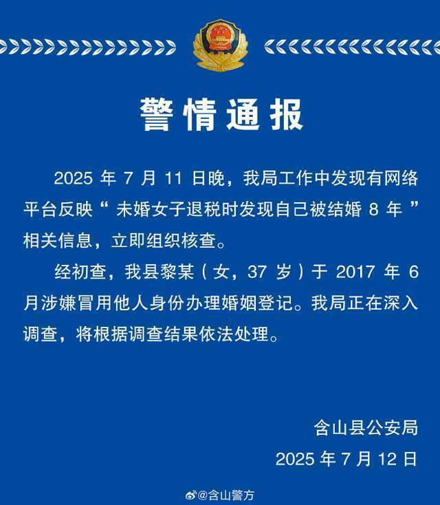 马鞍山含山县公安局12日就此事发布通报:7月11日晚,含山县公安局发现有网络平台反映“未婚女子退税时发现自己被结婚8年”相关信息,立即组织核查。经初查,该县黎某(女,37岁),于2017年6月涉嫌冒用他人身份办理婚姻登记。含山县公安局正在深入调查,将根据调查结果依法处理。