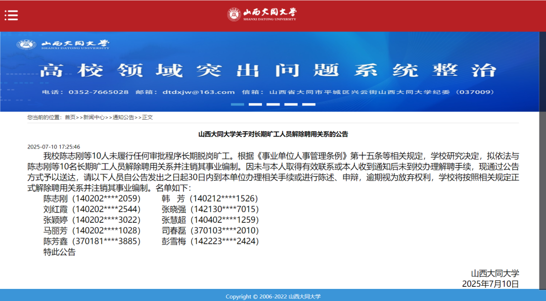 近日,山西大同大学发布“关于对长期旷工人员解除聘用关系的公告”: