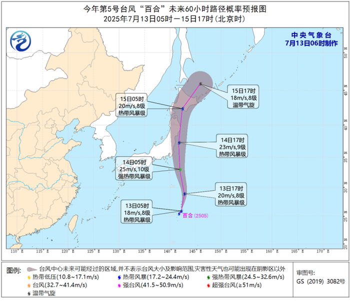 预计,“百合”将以每小时25~30公里的速度向偏北方向移动,强度将有所加强,逐渐向日本东部一带沿海靠近。未来“百合”对我国无影响。