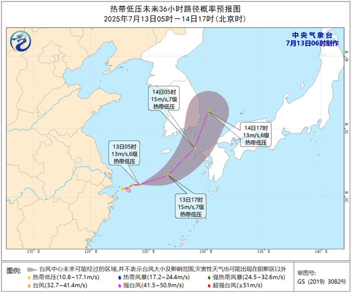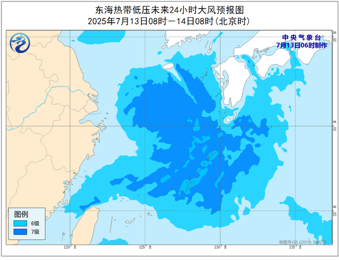东海热带低压的中心今天(13日)早晨5点钟位于浙江省舟山市东偏北方大约215公里的东海北部海面上,就是北纬30.9度、东经124.2度,中心附近最大风力有6级(13米/秒),中心最低气压为1000百帕。