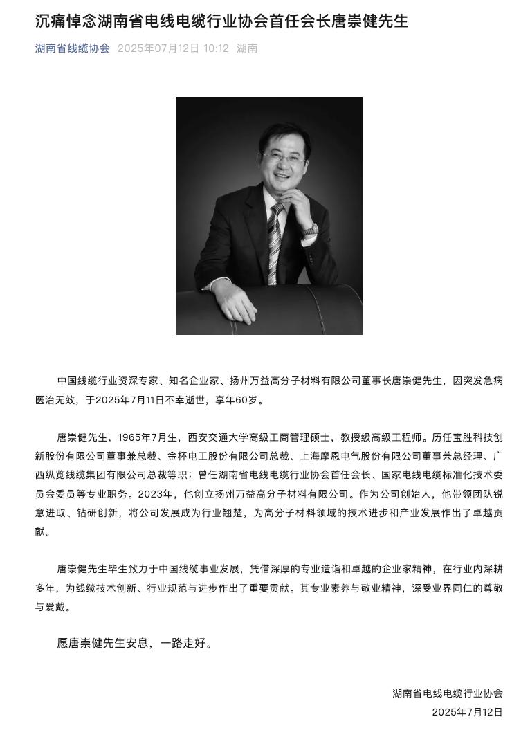 7月12日,湖南省电线电缆行业协会发布讣告:中国线缆行业资深专家、知名企业家、扬州万益高分子材料有限公司董事长唐崇健先生,因突发急病医治无效,于2025年7月11日不幸逝世,享年60岁。