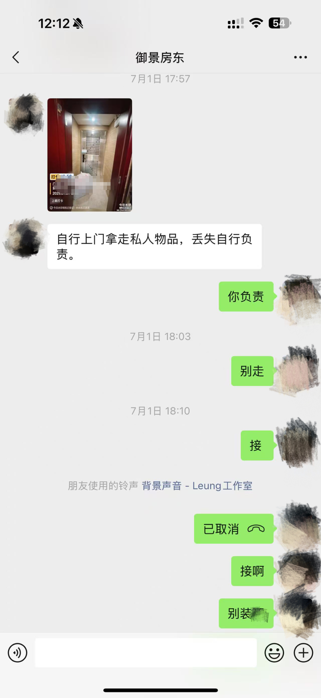 陈虹提供其与“御景房东”的聊天记录显示,7月1日下午4时,“御景房东”对陈虹称:“根据合同约束,你已拖延租金7天,按照合同约定收回该房屋,并解除合同,没收押金,并清理你的个人物品,请自行上门拿走,如有物品丢失自行承担。请知悉。”