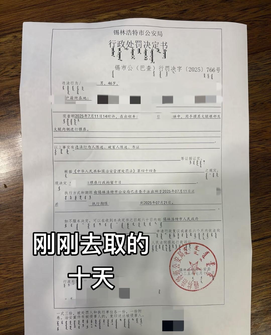 13日,红星新闻记者从巴彦查干派出所证实,警方已将涉事男子行政拘留,并处以行政处罚。程女士最新收到的《行政处罚决定书》显示,警方查明,2025年7月11日14时许,涉事男子在出租车上对受害者大腿内侧进行猥亵,以上事实有违法行为人陈述、被害人陈述和书证。根据《中华人民共和国治安管理处罚法》第四十四条规定,对违法行为人以猥亵行政拘留十日。