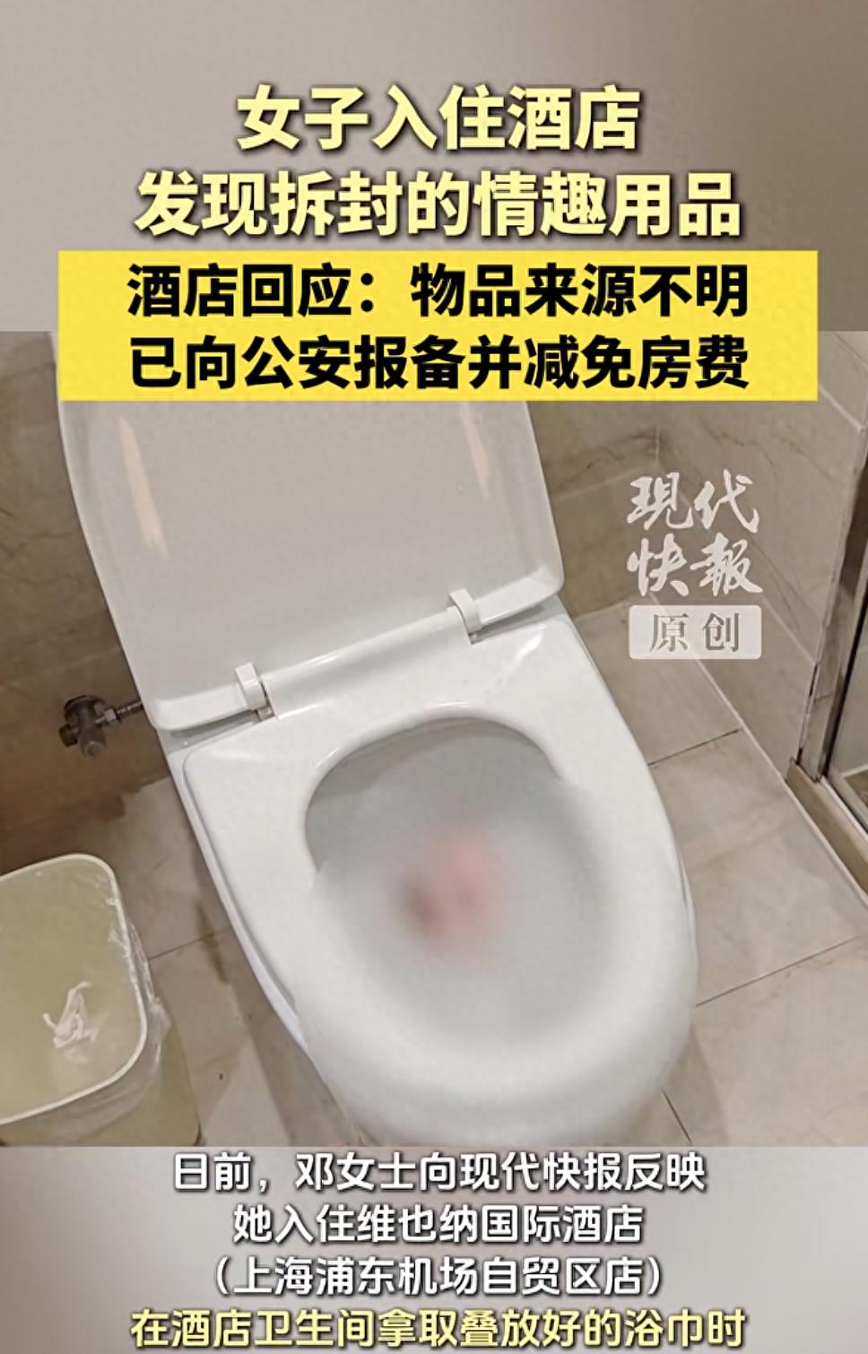 7月13日,邓女士向现代快报记者反映称,她入住维也纳国际酒店(上海浦东机场自贸区店)时,在酒店卫生间拿取叠放好的浴巾时,没想到竟从里面掉出一个拆封后的情趣用品。